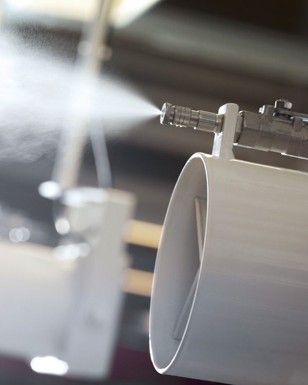 A series of spray units are strategically located in the area being humidified and are connected to a high pressure pump and water treatment system. Supply water is filtered to remove any minerals and then supplied to the spray units at between 50-70bar. When released through the high pressure nozzles, the water atomises and is absorbed by the air.
